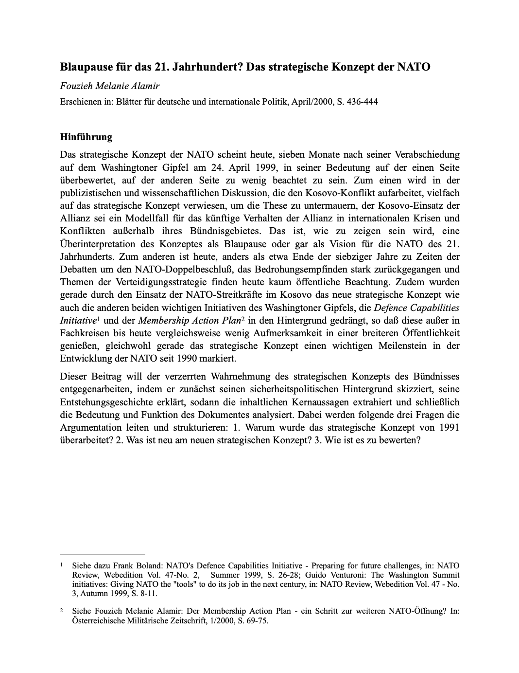 Dieser Beitrag skizziert zunächst den sicherheitspolitischen Hintergrund und erklärt die Entstehungsgeschichte des strategischen Konzepts der NATO von 1999. Auf dieser Grundlage extrahiert es die inhaltlichen Kernaussagen und analysiert schließlich die Bedeutung und Funktion des Dokumentes. Dabei leiten drei Fragen die Argumentation: 1. Warum wurde das strategische Konzept von 1991 überarbeitet? 2. Was ist neu am neuen strategischen Konzept? 3. Wie ist es zu bewerten?
