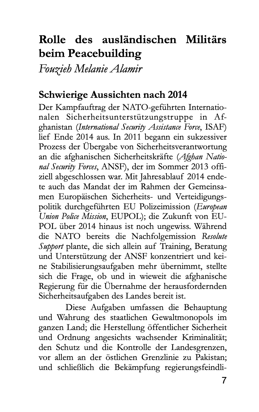 Der Wiederaufbau in Afghanistan war und ist eine Herausforderung, die nur mit konzertierten zivilen und militärischen Mitteln zu bewerkstelligen ist. Vor dem Hintergrund der Reduzierung der internationalen militärischen Präsenz und des Rückgangs der Präsenz internationaler ziviler Organisationen erscheint ein kohärentes Handeln der verbleibenden zivilen und militärischen Akteure wichtiger denn je. Wie aber ist es um die Zukunft des vernetzten Ansatzes in Afghanistan bestellt und welche Rolle wird das Militär künftig in vergleichbaren Peacebuilding-Prozessen spielen? Um dieser Frage nachzugehen, werden zunächst ausgewählte Handlungsfelder im afghanischen Wiederaufbau aufgezeigt und deren generische zivil-militärische Schnittstellen beschrieben. Hierbei wirdbesonderes Augenmerk auf die Rollen und Aufgaben des Militärs jenseits kinetischer Operationen gerichtet. In einem weiteren Schritt werden die künftigen Arbeitsbedingungen ziviler Organisationen in Afghanistan antizipiert und ein Blick auf zivil-militärisches Schnittstellenmanagement in Afghanistan geworfen. Abschließend wird reflektiert, welche Schlussfolgerungen für kohärentes zivil-militärisches Handeln auch für andere komplexe Peacebuilding-Szenarien daraus zu ziehen sind.