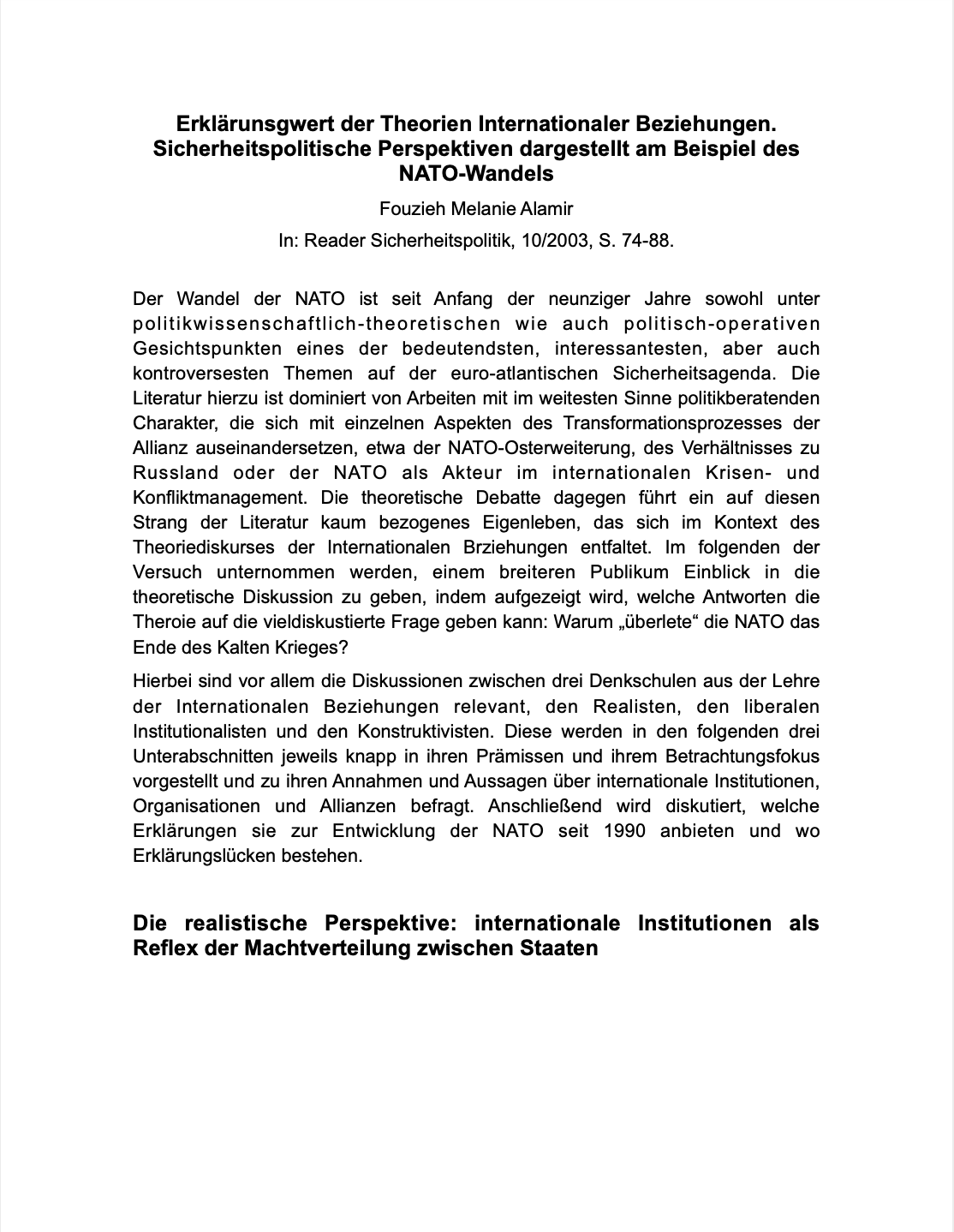 Der Wandel der NATO ist seit Anfang der neunziger Jahre sowohl unter politikwissenschaftlich-theoretischen wie auch politisch-operativen Gesichtspunkten eines der bedeutendsten, interessantesten, aber auch kontroversesten Themen auf der euro-atlantischen Sicherheitsagenda. Die theoretische Debatte hierzu führt ein Eigenleben, das sich im Kontext des Theoriediskurses der Internationalen Beziehungen entfaltet. In dem Artikel wird einem breiteren Publikum Einblick in die theoretische Diskussion gegeben, indem durch die Brille führender theoretischer Schulen der internationalen Beziehungen aufgezeigt wird, welche Antworten die Theorie auf die viel diskutierte Frage geben kann: Warum „überlebte“ die NATO das Ende des Kalten Krieges?